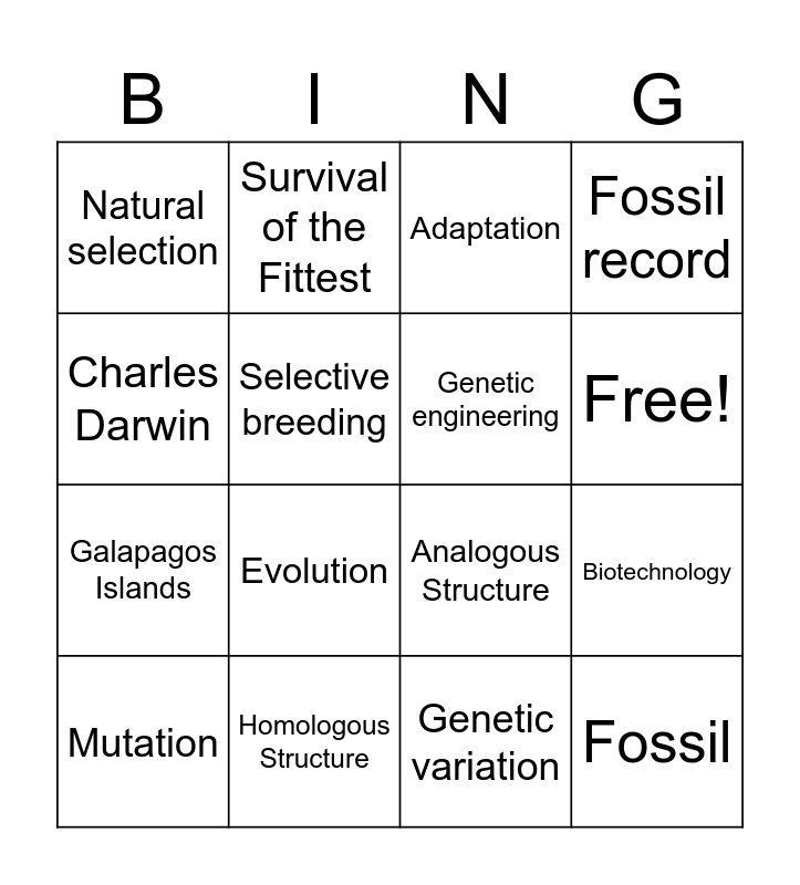 This bingo card has 17 words: Genetic variation, Mutation, Adaptation, Natural selection, Evolution, Fossil record, Biotechnology, Genetic engineering, Free!, Selective breeding, Homologous Structure, Analogous Structure, Charles Darwin, Survival of the Fittest, Galapagos Islands, Genes and Fossil.