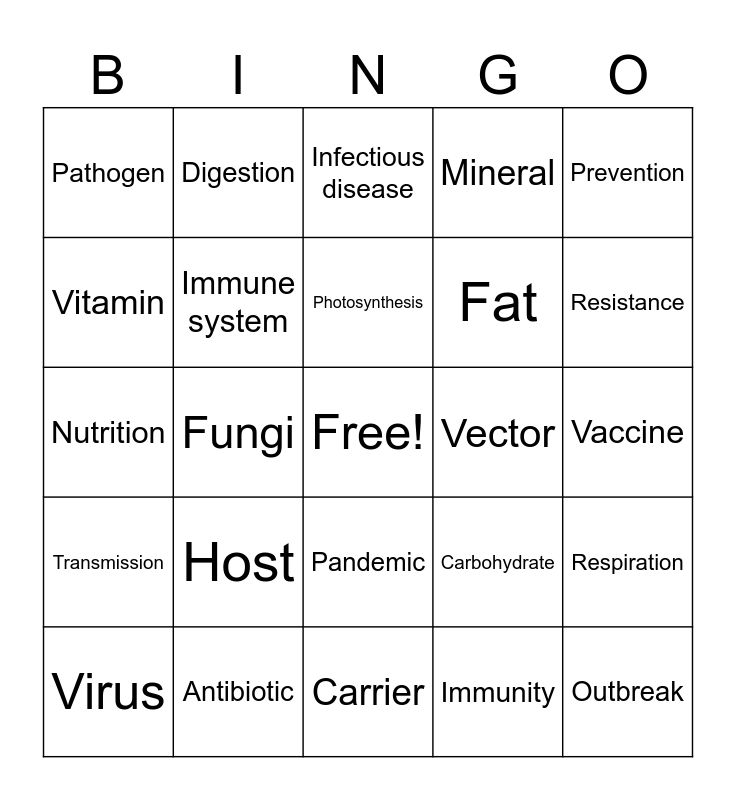This bingo card has a free space and 29 words: Virus, Bacteria, Fungi, Parasite, Pathogen, Infectious disease, Immune system, Host, Vector, Antibiotic, Vaccine, Outbreak, Carrier, Immunity, Resistance, Epidemic, Pandemic, Transmission, Prevention, Nutrition, Carbohydrate, Protein, Fat, Vitamin, Mineral, Digestion, Respiration, Photosynthesis and Glucose.