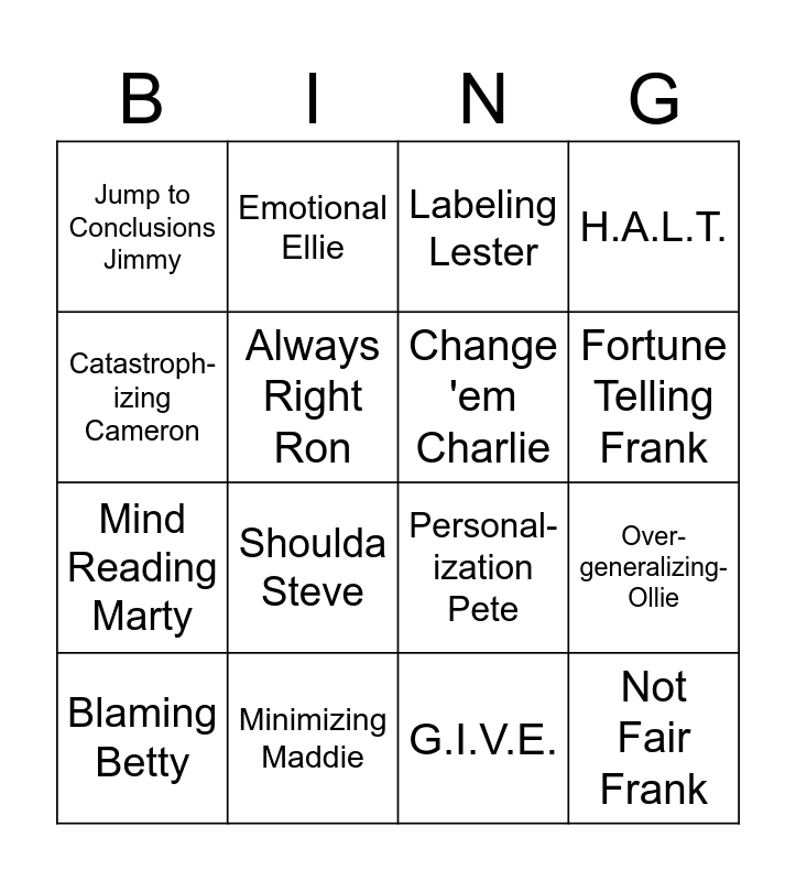 This bingo card has 20 words: Over- generalizing- Ollie, All or Nothing Allie, Labeling Lester, Filtering Freddy, Blaming Betty, Catastroph-izing Cameron, Minimizing Maddie, Jump to Conclusions Jimmy, Mind Reading Marty, Emotional Ellie, Shoulda Steve, Personal-ization Pete, Always Right Ron, Not Fair Frank, Change 'em Charlie, Negative Nancy, Fortune Telling Frank, H.A.L.T., G.I.V.E. and S.T.O.P..