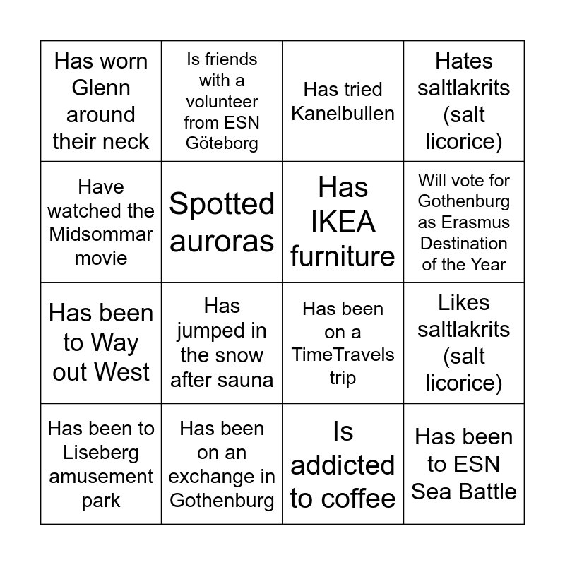 This bingo card has 16 words: Has been on an exchange in Gothenburg, Likes saltlakrits (salt licorice), Has tried Kanelbullen, Has worn Glenn around their neck, Has been to Way out West, Is friends with a volunteer from ESN Göteborg, Has been on a TimeTravels trip, Is addicted to coffee, Have watched the Midsommar movie, Spotted auroras, Has been to Liseberg amusement park, Hates saltlakrits (salt licorice), Has jumped in the snow after sauna, Will vote for Gothenburg as Erasmus Destination of the Year, Has IKEA furniture and Has been to ESN Sea Battle.