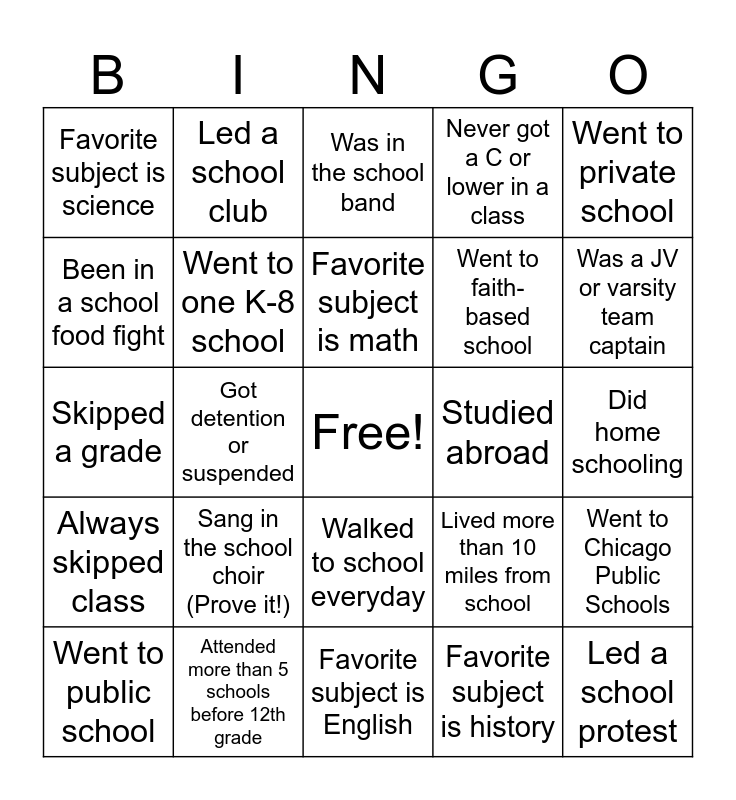 This bingo card has a free space and 24 words: Sang in the school choir (Prove it!), Attended more than 5 schools before 12th grade, Favorite subject is math, Went to public school, Went to private school, Favorite subject is science, Been in a school food fight, Led a school club, Studied abroad, Walked to school everyday, Went to faith-based school, Skipped a grade, Lived more than 10 miles from school, Went to Chicago Public Schools, Went to one K-8 school, Favorite subject is history, Did home schooling, Was in the school band, Was a JV or varsity team captain, Got detention or suspended, Led a school protest, Always skipped class, Never got a C or lower in a class and Favorite subject is English.