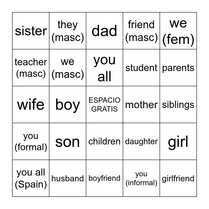 This bingo card has a free space and 34 words: I, you (informal), he, she, you (formal), we (masc), we (fem), you all (Spain), they (masc), they (fem), you all, dad, father, mom, mother, parents, husband, wife, son, daughter, children, brother, sister, siblings, boyfriend, girlfriend, friend (masc), friend (fem), student, teacher (masc), teacher (fem), boy, girl and person.