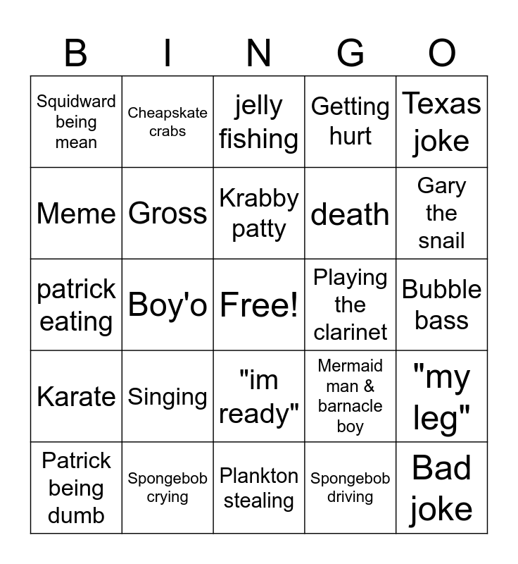 This bingo card has a free space and 24 words: Singing, Spongebob crying, Krabby patty, Patrick being dumb, Texas joke, Squidward being mean, Meme, Cheapskate crabs, Playing the clarinet, "im ready", death, patrick eating, Mermaid man & barnacle boy, "my leg", Gross, Spongebob driving, Bubble bass, jelly fishing, Gary the snail, Boy'o, Bad joke, Karate, Getting hurt and Plankton stealing.