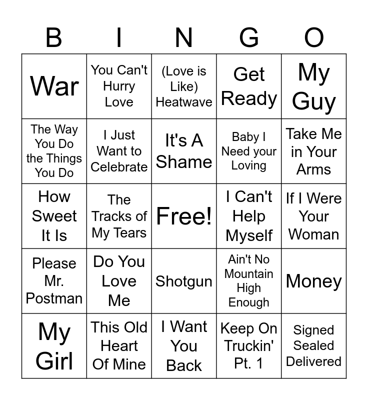 This bingo card has a free space and 29 words: My Girl, Baby Love, The Tracks of My Tears, I Heard It Through the Grapevine, War, (Love is Like) Heatwave, I Just Want to Celebrate, Do You Love Me, I Can't Help Myself, This Old Heart Of Mine, If I Were Your Woman, Signed Sealed Delivered, I Want You Back, Keep On Truckin' Pt. 1, Take Me in Your Arms, Don't Leave Me This Way, Shotgun, Please Mr. Postman, My Guy, How Sweet It Is, Ain't No Mountain High Enough, Brick House, Baby I Need your Loving, The Way You Do the Things You Do, Get Ready, You Can't Hurry Love, Money, It's A Shame and Dancing In The Street.