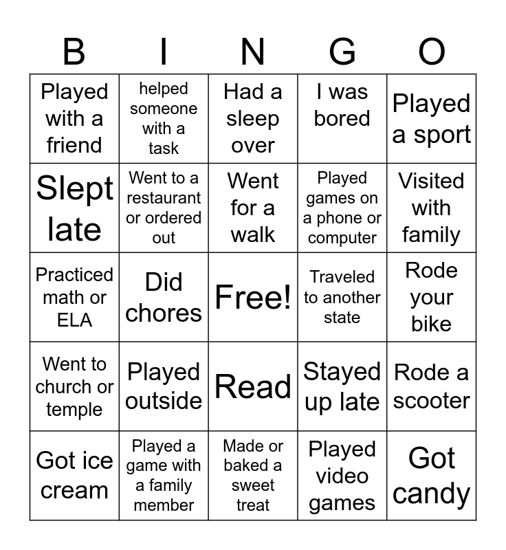 This bingo card has a free space and 24 words: Played outside, Played a game with a family member, Went for a walk, Got ice cream, Played a sport, Played with a friend, Slept late, helped someone with a task, Traveled to another state, Read, Played games on a phone or computer, Practiced math or ELA, Stayed up late, Rode a scooter, Went to a restaurant or ordered out, Played video games, Rode your bike, Had a sleep over, Visited with family, Did chores, Got candy, Went to church or temple, I was bored and Made or baked a sweet treat.