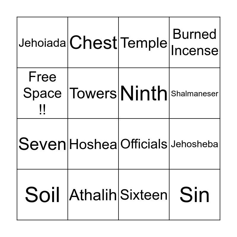 This bingo card has 16 words: Athalih, Jehosheba, Temple, Jehoiada, Seven, Chest, Officials, Sixteen, Free Space !!, Towers, Soil, Burned Incense, Hoshea, Shalmaneser, Ninth and Sin.