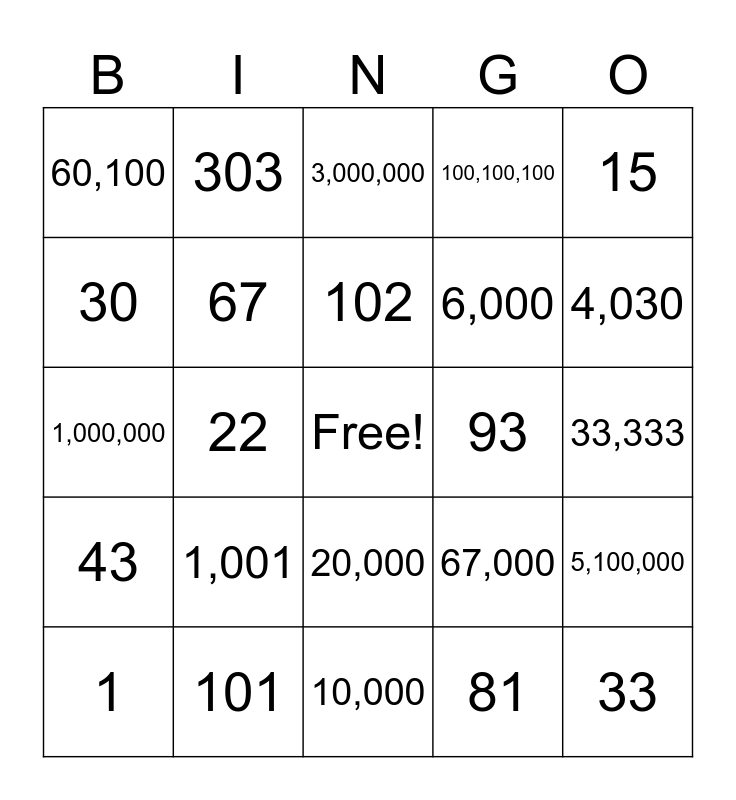 This bingo card has a free space and 29 words: 1, 1,000,000,000, 22, 250, 60,100, 3,000,000, 67, 1,001, 93, 101, 33,333, 33, 10,000, 81, 4,030, 1,305, 20,000, 43, 15, 1,000,000, 67,000, 66, 6,000, 30, 100,100,100, 303, 5,100,000, 102 and 3.