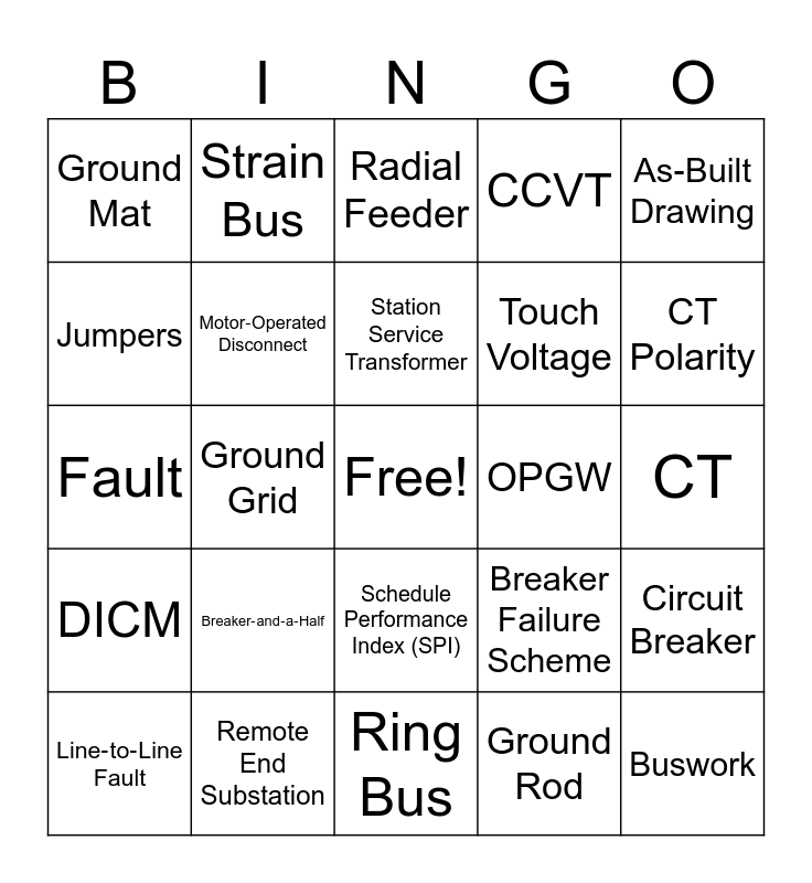 This bingo card has a free space and 52 words: Power Transformer, Buswork, Transfer Bus, Ring Bus, Breaker‑and‑a‑Half, Dead‑End Structure, Strain Bus, Rigid Bus, Jumpers, Disconnect Switch (DS), Motor‑Operated Disconnect, Ground Switch, Circuit Breaker, Breaker Failure Scheme, Surge Arrester, Wave/Line Trap, Station Service Transformer, OPGW, Control House, As‑Built Drawing, Ground Grid, Ground Rod, Ground Mat, Touch Voltage, Step Voltage, ADSS Fiber, SCADA, Control Cable, CT Polarity, CT Saturation, VT / PT, CCVT, Touch voltage, Step voltage, Bus Differential, Radial Feeder, Remote End Substation, Expansion Connection, Greenfield Station, Brownfield Station, Business Protocol Identification, CT, DICM, Cost Performance Index (CPI), Schedule Performance Index (SPI), Sulfur Hexafluoride (SF6), Remote Terminal Unit(RTU), Fault, Tie Breaker, Line‑to‑Ground Fault, Line‑to‑Line Fault and Regulator.