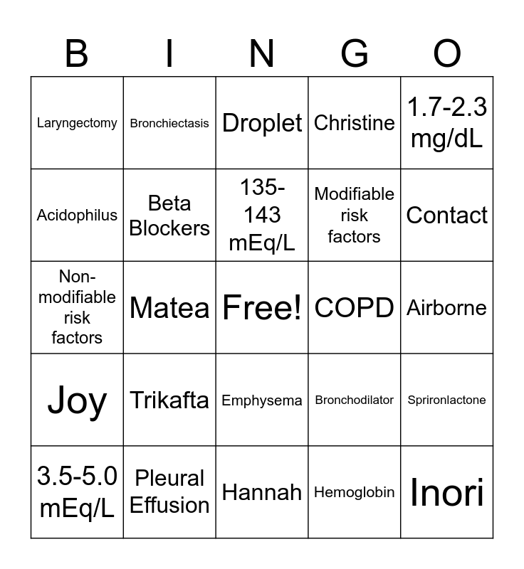 This bingo card has a free space and 24 words: Trikafta, Pleural Effusion, 135-143 mEq/L, 3.5-5.0 mEq/L, 1.7-2.3 mg/dL, Laryngectomy, Acidophilus, Bronchiectasis, COPD, Emphysema, Modifiable risk factors, Non-modifiable risk factors, Bronchodilator, Sprironlactone, Beta Blockers, Hemoglobin, Airborne, Droplet, Contact, Matea, Inori, Joy, Christine and Hannah.