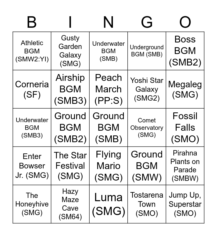 This bingo card has a free space and 24 words: The Honeyhive (SMG), The Star Festival (SMG), Peach March (PP:S), Tostarena Town (SMO), Boss BGM (SMB2), Athletic BGM (SMW2:YI), Gusty Garden Galaxy (SMG), Underwater BGM (SMB), Comet Observatory (SMG), Fossil Falls (SMO), Underwater BGM (SMB3), Airship BGM (SMB3), Ground BGM (SMW), Pirahna Plants on Parade (SMBW), Corneria (SF), Hazy Maze Cave (SM64), Luma (SMG), Underground BGM (SMB), Megaleg (SMG), Enter Bowser Jr. (SMG), Ground BGM (SMB2), Flying Mario (SMG), Yoshi Star Galaxy (SMG2) and Jump Up, Superstar (SMO).