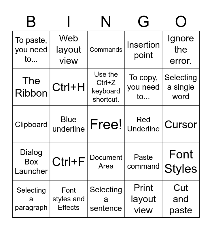 This bingo card has a free space and 37 words: Ctrl + V, Thesaurus, Replace tool, Ctrl+H, Font Styles, Ctrl+F, Use the Ctrl+Z keyboard shortcut., Right-click on the spelling error, Ignore the error., Ctrl+X, Blue underline, Insertion point, Cut and paste, Cursor, The Ribbon, Dialog Box Launcher, Tabs, Commands, Document Area, Red Underline, To paste, you need to..., Selecting a single word, Selecting a paragraph, Selecting a sentence, Full screen reading view, Print layout view, Web layout view, Delete Key, Backspace Key, Autocorrect, Font, Font styles and Effects, Clipboard, Copy and Cut command, Paste command, To copy, you need to... and To copy you need to....