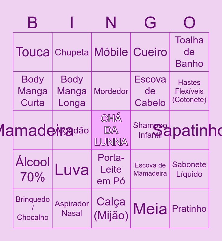 This bingo card has a free space and 38 words: Fralda Descartável, Lenço Umedecido, Pomada de Assadura, Shampoo Infantil, Sabonete Líquido, Álcool 70%, Algodão, Cortador de Unha, Escova de Cabelo, Hastes Flexíveis (Cotonete), Body Manga Curta, Body Manga Longa, Meia, Sapatinho, Touca, Luva, Macacão, Cueiro, Babador, Mamadeira, Chupeta, Calça (Mijão), Escova de Mamadeira, Pratinho, Colher de Silicone, Copo de Transição, Porta-Leite em Pó, Berço, Manta, Naninha, Termômetro, Mordedor, Banheira, Toalha de Banho, Brinquedo / Chocalho, Aspirador Nasal, Móbile and Trocador Portátil.