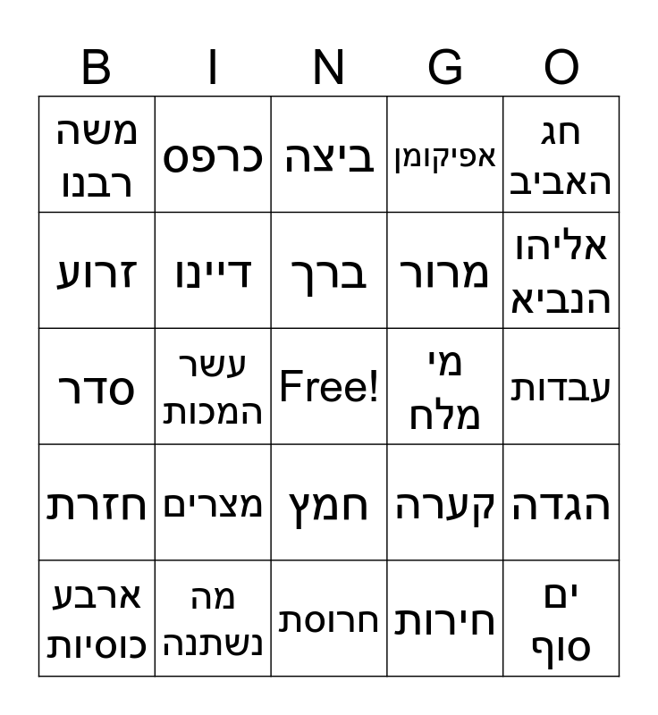 This bingo card has a free space and 27 words: קערה, מצה, מרור, חרוסת, זרוע, ביצה, כרפס, חזרת, מי מלח, הגדה, סדר, אפיקומן, ארבע כוסיות, מה נשתנה, אליהו הנביא, חד גדיא, דיינו, ברך, מצרים, משה רבנו, עבדות, חירות, עשר המכות, ים סוף, חמץ, חג האביב and קרבן פסח.