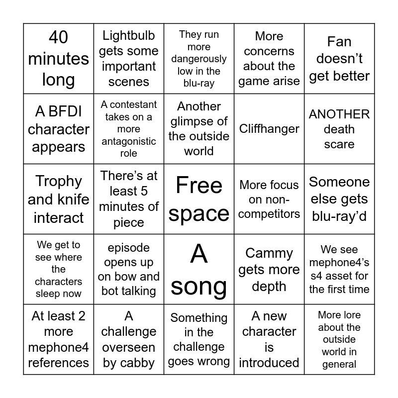 This bingo card has a free space and 24 words: episode opens up on bow and bot talking, A challenge overseen by cabby, Another glimpse of the outside world, At least 2 more mephone4 references, Fan doesn’t get better, 40 minutes long, A BFDI character appears, Lightbulb gets some important scenes, More focus on non-competitors, A song, Cliffhanger, Trophy and knife interact, Cammy gets more depth, We see mephone4’s s4 asset for the first time, A contestant takes on a more antagonistic role, A new character is introduced, Someone else gets blu-ray’d, They run more dangerously low in the blu-ray, ANOTHER death scare, There’s at least 5 minutes of piece, More lore about the outside world in general, We get to see where the characters sleep now, More concerns about the game arise and Something in the challenge goes wrong.
