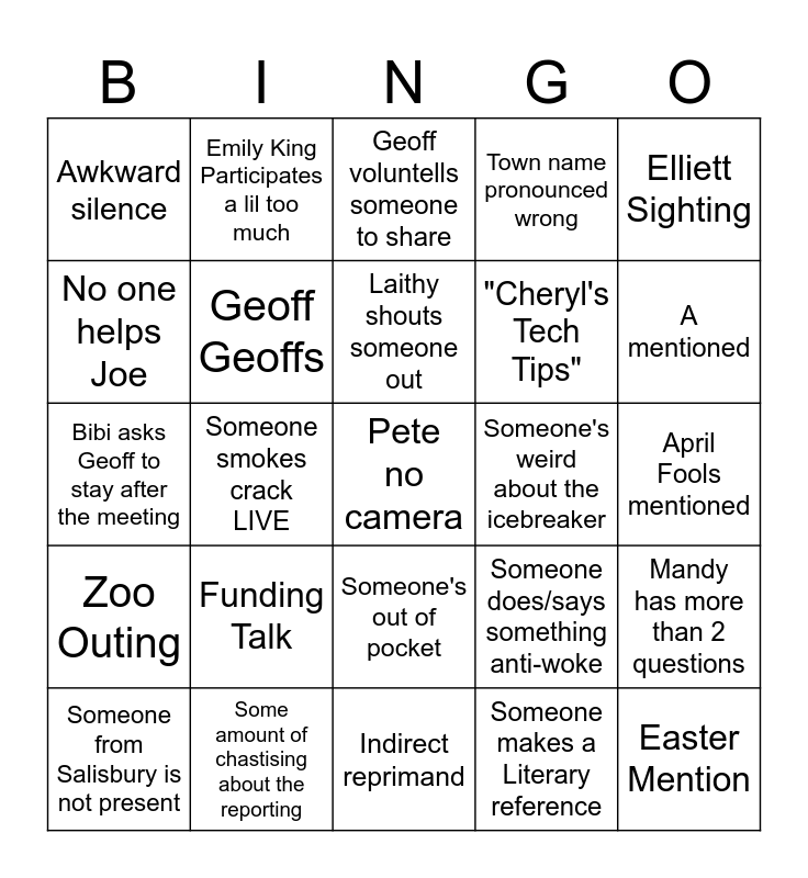 This bingo card has a free space and 24 words: Funding Talk, Some amount of chastising about the reporting, Laithy shouts someone out, Someone from Salisbury is not present, Elliett Sighting, Awkward silence, No one helps Joe, Emily King Participates a lil too much, Someone's weird about the icebreaker, Someone's out of pocket, "Cheryl's Tech Tips", Bibi asks Geoff to stay after the meeting, Someone does/says something anti-woke, Mandy has more than 2 questions, Geoff Geoffs, Someone makes a Literary reference, April Fools mentioned, Geoff voluntells someone to share, A mentioned, Someone smokes crack LIVE, Easter Mention, Zoo Outing, Town name pronounced wrong and Indirect reprimand.