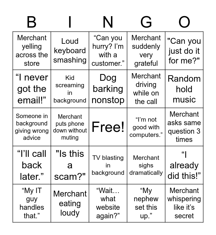 This bingo card has a free space and 24 words: "Is this a scam?", Merchant eating loudy, Dog barking nonstop, “My IT guy handles that.”, "Can you just do it for me?", Merchant yelling across the store, “I never got the email!”, Loud keyboard smashing, “I’m not good with computers.”, TV blasting in background, Merchant driving while on the call, Someone in background giving wrong advice, Merchant sighs dramatically, “I already did this!”, Kid screaming in background, “My nephew set this up.”, Merchant asks same question 3 times, “Can you hurry? I’m with a customer.”, Random hold music, Merchant puts phone down without muting, Merchant whispering like it’s secret, “I’ll call back later.”, Merchant suddenly very grateful and “Wait…what website again?”.