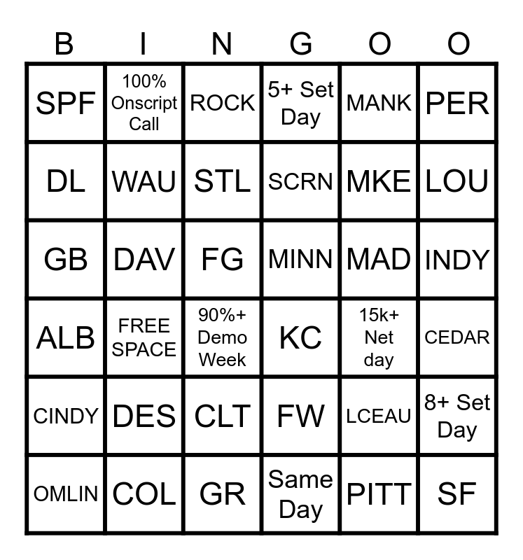 This bingo card has 36 words: FW, CLT, Same Day, DL, ALB, MINN, WAU, GR, MANK, LCEAU, LOU, 5+ Set Day, 8+ Set Day, DAV, SCRN, SPF, CINDY, MAD, GB, ROCK, FG, FREE SPACE, KC, 90%+ Demo Week, 15k+ Net day, 100% Onscript Call, MKE, COL, STL, PER, SF, OMLIN, CEDAR, INDY, DES and PITT.
