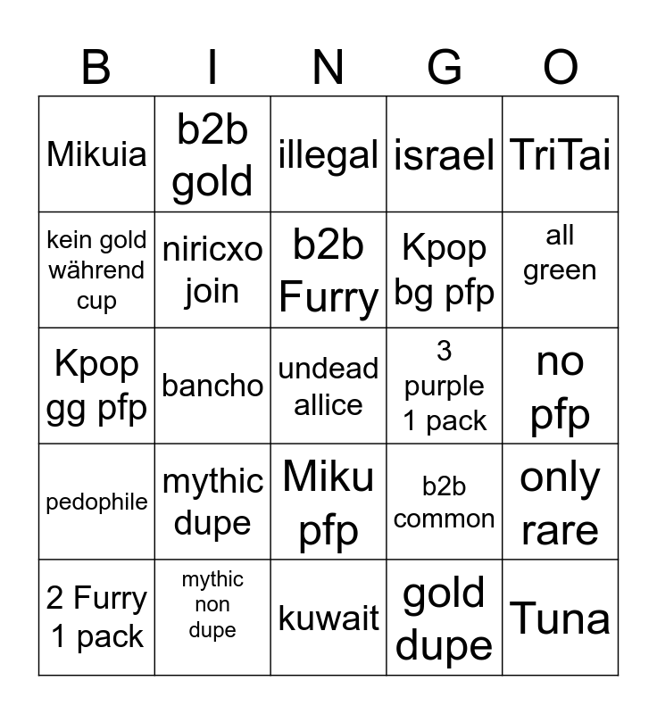 This bingo card has a free space and 24 words: mythic dupe, mythic non dupe, b2b Furry, 2 Furry 1 pack, TriTai, Mikuia, kein gold während cup, b2b gold, 3 purple 1 pack, Miku pfp, Kpop bg pfp, Kpop gg pfp, b2b common, only rare, niricxo join, gold dupe, no pfp, illegal, all green, bancho, Tuna, pedophile, israel and kuwait.