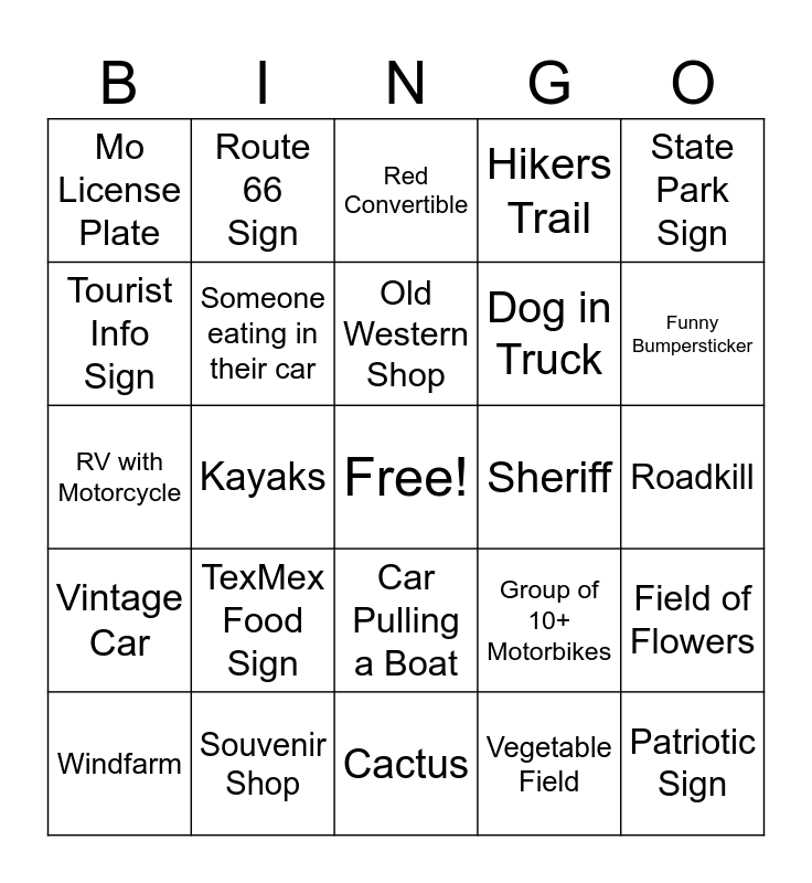 This bingo card has a free space and 25 words: TexMex Food Sign, Cactus, Old Western Shop, Windfarm, State Park Sign, Mo License Plate, Tourist Info Sign, Route 66 Sign, Sheriff, Car Pulling a Boat, Dog in Truck, RV with Motorcycle, Group of 10+ Motorbikes, Field of Flowers, Someone eating in their car, Tire on side of Road, Roadkill, Red Convertible, Funny Bumpersticker, Kayaks, Patriotic Sign, Souvenir Shop, Vintage Car, Hikers Trail and Vegetable Field.