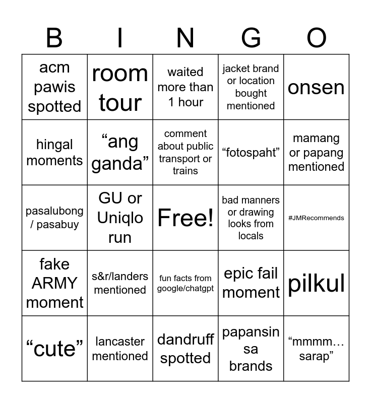 This bingo card has a free space and 55 words: “manamis namis”, “cute”, paulit ulit ang sinasabi, acm pawis spotted, dandruff spotted, ate more than 3 meals, “ang ganda”, konbini run/mentioned, “fotospaht”, tripod spotted, jacket brand or location bought mentioned, fit check, cap brand mentioned, “ang lamig…” “feels like…”, usok check, BG book reading update, onsen, GU or Uniqlo run, toilet mentioned, “mmmm… sarap”, bad manners or drawing looks from locals, ah mahn moment 👅, epic fail moment, waited more than 1 hour, taxi (divided by 3), comment about public transport or trains, papansin sa brands, organizing files mentioned, #JMRecommends, pilkul, “thank you lord!”, recognized or nagpapicture with a fam, “burst in your mouth”, misinformation provided, hingal moments, pasalubong / pasabuy, jisulife fan spotted, fake ARMY moment, klook circle cc mentioned, baby suck mentioned, room tour, snacks eaten, sony xm5s spotted, nagpapansin sa mga brands #bekenemen, s&r/landers mentioned, lancaster mentioned, "zurich" toyota fortuner included sa vlog, airism + heat tech combo, cazambahays mentioned, mamang or papang mentioned, cherry blossoms mentioned, use my klook code, use my agoda code, fun facts from google/chatgpt and chatgpt reflection sa end ng vlog.
