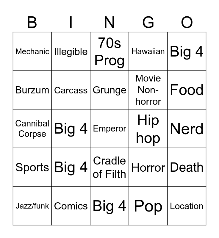 This bingo card has a free space and 24 words: Big 4, Comics, Grunge, Jazz/funk, Big 4, Mechanic, Burzum, Illegible, Hip hop, Cradle of Filth, Movie Non-horror, Cannibal Corpse, Horror, Death, Carcass, Pop, Nerd, 70s Prog, Food, Big 4, Location, Sports, Hawaiian and Big 4.