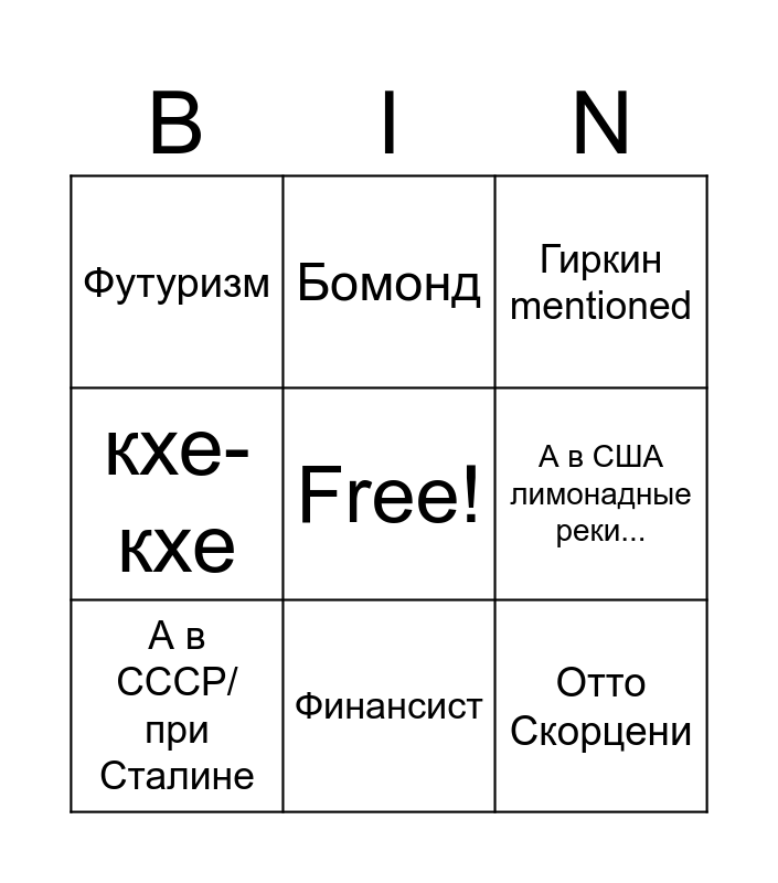 This bingo card has a free space and 8 words: А в США лимонадные реки..., Гиркин mentioned, Бомонд, А в СССР/при Сталине, Футуризм, Отто Скорцени, кхе-кхе and Финансист.