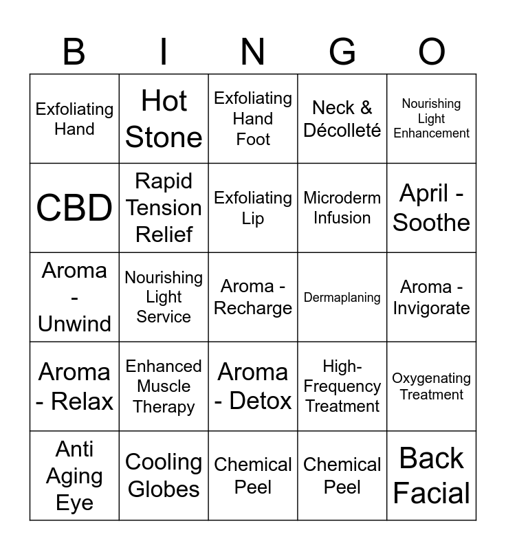 This bingo card has a free space and 24 words: Enhanced Muscle Therapy, Cooling Globes, Exfoliating Lip, Anti Aging Eye, Nourishing Light Enhancement, Exfoliating Hand, CBD, Hot Stone, Dermaplaning, Aroma - Detox, Microderm Infusion, Aroma - Unwind, High-Frequency Treatment, Oxygenating Treatment, Rapid Tension Relief, Chemical Peel, Aroma - Invigorate, Exfoliating Hand Foot, April - Soothe, Nourishing Light Service, Back Facial, Aroma - Relax, Neck & Décolleté and Chemical Peel.