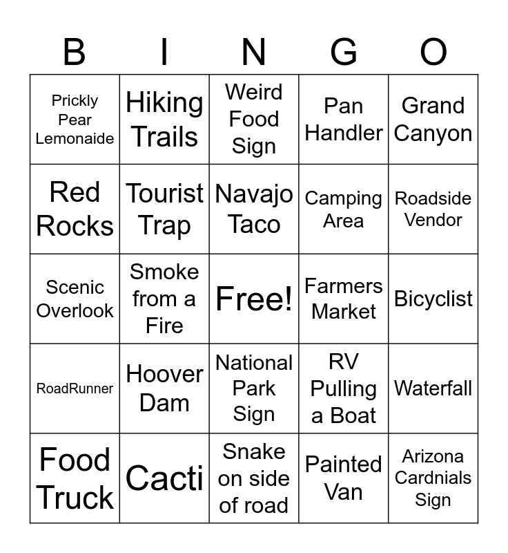 This bingo card has a free space and 24 words: Hoover Dam, Cacti, Navajo Taco, Food Truck, Grand Canyon, Prickly Pear Lemonaide, Red Rocks, Hiking Trails, Farmers Market, National Park Sign, Camping Area, Scenic Overlook, RV Pulling a Boat, Waterfall, Tourist Trap, Painted Van, Bicyclist, Weird Food Sign, Roadside Vendor, Smoke from a Fire, Arizona Cardnials Sign, RoadRunner, Pan Handler and Snake on side of road.