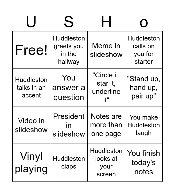 This bingo card has 16 words: Vinyl playing, Huddleston claps, Meme in slideshow, Huddleston calls on you for starter, Huddleston talks in an accent, Huddleston greets you in the hallway, Notes are more than one page, You make Huddleston laugh, Free!, You answer a question, Huddleston looks at your screen, "Stand up, hand up, pair up", Video in slideshow, President in slideshow, "Circle it, star it, underline it" and You finish today's notes.