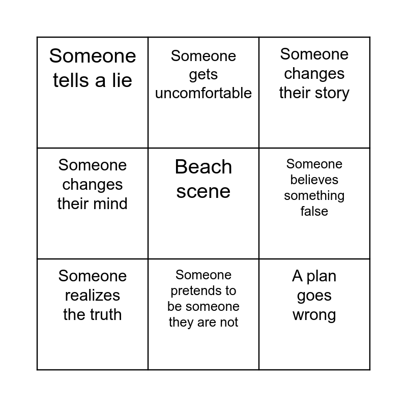 This bingo card has 15 words: Someone fakes an accent, Someone is surprised, Someone changes their story, Someone tells a lie, Someone pretends to be someone they are not, Beach scene, Someone gets caught, Someone apologizes, Someone believes something false, A plan goes wrong, Someone makes a deal, Someone changes their mind, Someone realizes the truth, Someone gets uncomfortable and Someone changes their mind about a person.