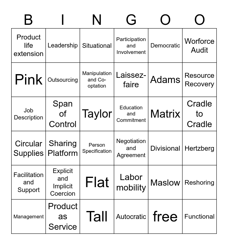 This bingo card has 36 words: Labor mobility, Flat, Autocratic, Pink, Circular Supplies, Education and Commitment, Outsourcing, Tall, Democratic, Maslow, Resource Recovery, Participation and Involvement, Reshoring, Span of Control, Laissez-faire, Product life extension, Facilitation and Support, Matrix, Job Description, Situational, Taylor, Sharing Platform, Negotiation and Agreement, Person Specification, Divisional, Leadership, Adams, Product as Service, Manipulation and Co-optation, Worforce Audit, Functional, Management, Hertzberg, Cradle to Cradle, Explicit and Implicit Coercion and free.