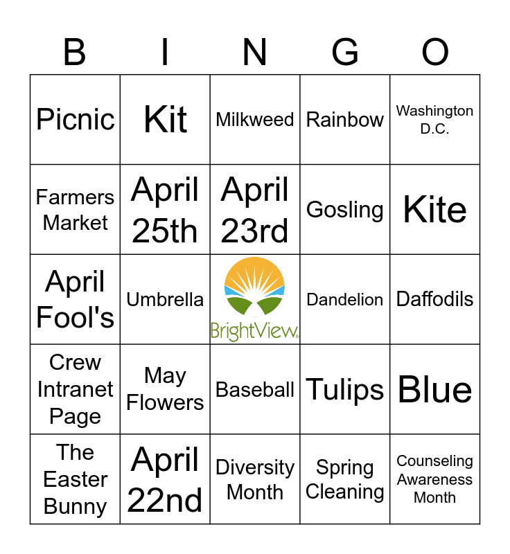 This bingo card has a free space and 24 words: May Flowers, April 22nd, April 23rd, The Easter Bunny, Washington D.C., Picnic, Farmers Market, Kit, Dandelion, Baseball, Gosling, April Fool's, Tulips, Blue, April 25th, Spring Cleaning, Daffodils, Milkweed, Kite, Umbrella, Counseling Awareness Month, Crew Intranet Page, Rainbow and Diversity Month.