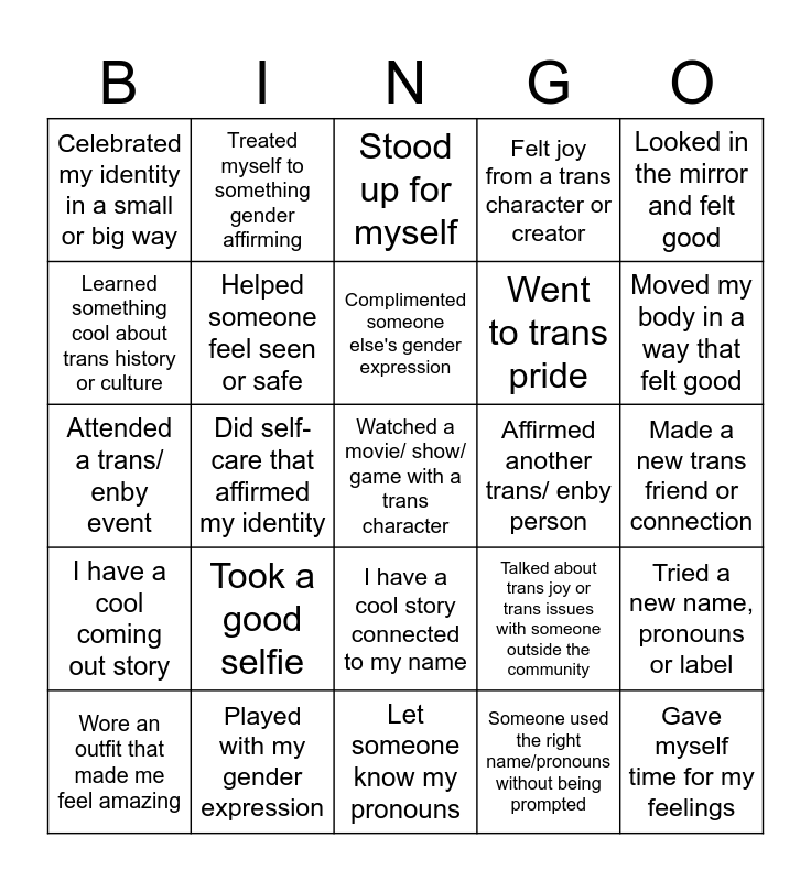 This bingo card has a free space and 24 words: Wore an outfit that made me feel amazing, Took a good selfie, Complimented someone else's gender expression, Someone used the right name/pronouns without being prompted, Looked in the mirror and felt good, Celebrated my identity in a small or big way, Treated myself to something gender affirming, Stood up for myself, Affirmed another trans/ enby person, Made a new trans friend or connection, Attended a trans/ enby event, Helped someone feel seen or safe, Talked about trans joy or trans issues with someone outside the community, Tried a new name, pronouns or label, Learned something cool about trans history or culture, Played with my gender expression, Let someone know my pronouns, Felt joy from a trans character or creator, Moved my body in a way that felt good, I have a cool coming out story, Did self-care that affirmed my identity, I have a cool story connected to my name, Went to trans pride and Gave myself time for my feelings.