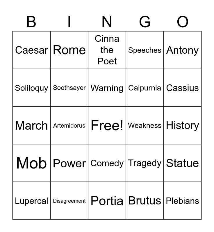This bingo card has a free space and 50 words: Octavius, Plebians, Pompey, Portia, Power, Publius, Rome, Shakespeare, Soliloquy, Sonnet, Soothsayer, Speeches, Statue, Tragedy, Trebonius, Triumvirate, Warning, Weakness, Ambition, Antony, Artemidorus, Brutus, Caesar, Calpurnia, Capital, Casca, Cassius, Cinna, Cinna the Poet, Comedy, Crassus, Daggar, Death, Decius, Disagreement, Dream, Emperor, Flavius, Funeral, History, Honor, Ides, Letters, Lucius, Lupercal, March, Marullus, Metellus, Mob and Murder.