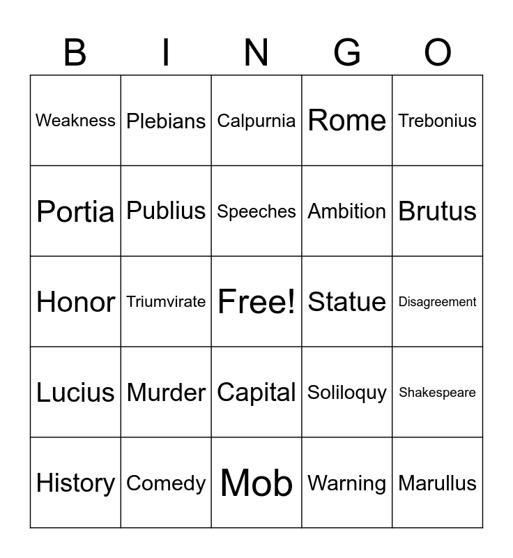 This bingo card has a free space and 50 words: March, Marullus, Metellus, Mob, Murder, Octavius, Plebians, Pompey, Portia, Power, Publius, Rome, Shakespeare, Soliloquy, Sonnet, Soothsayer, Speeches, Statue, Tragedy, Trebonius, Triumvirate, Warning, Weakness, Ambition, Antony, Artemidorus, Brutus, Caesar, Calpurnia, Capital, Casca, Cassius, Cinna, Cinna the Poet, Comedy, Crassus, Daggar, Death, Decius, Disagreement, Dream, Emperor, Flavius, Funeral, History, Honor, Ides, Letters, Lucius and Lupercal.