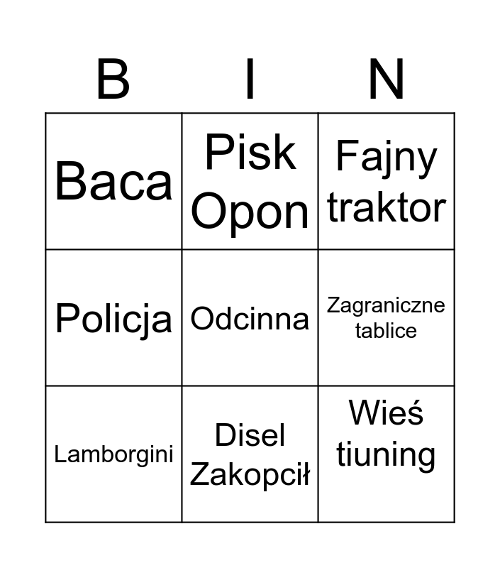 This bingo card has a free space and 11 words: Auto Zgasło, Disel Zakopcił, Wieś tiuning, Lamborgini, Pisk Opon, Fajny traktor, Zagraniczne tablice, Fajny tir, Policja, Baca and Podejrzane auto.