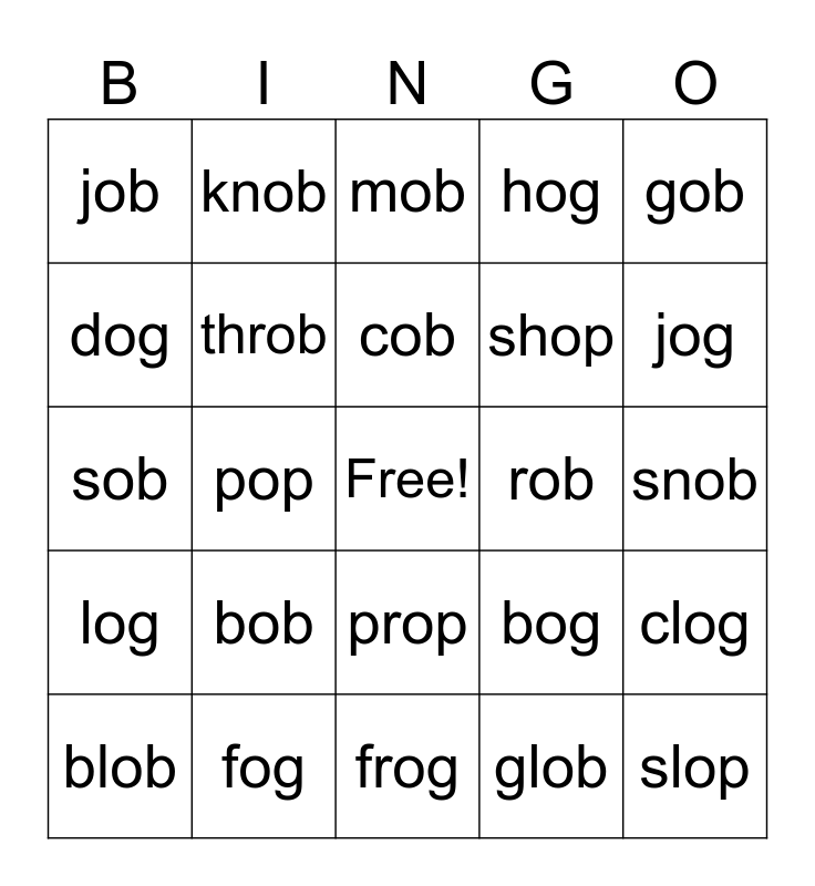 This bingo card has a free space and 24 words: blob, bob, cob, glob, gob, job, knob, mob, rob, snob, sob, throb, bog, clog, dog, fog, frog, hog, jog, log, pop, prop, shop and slop.