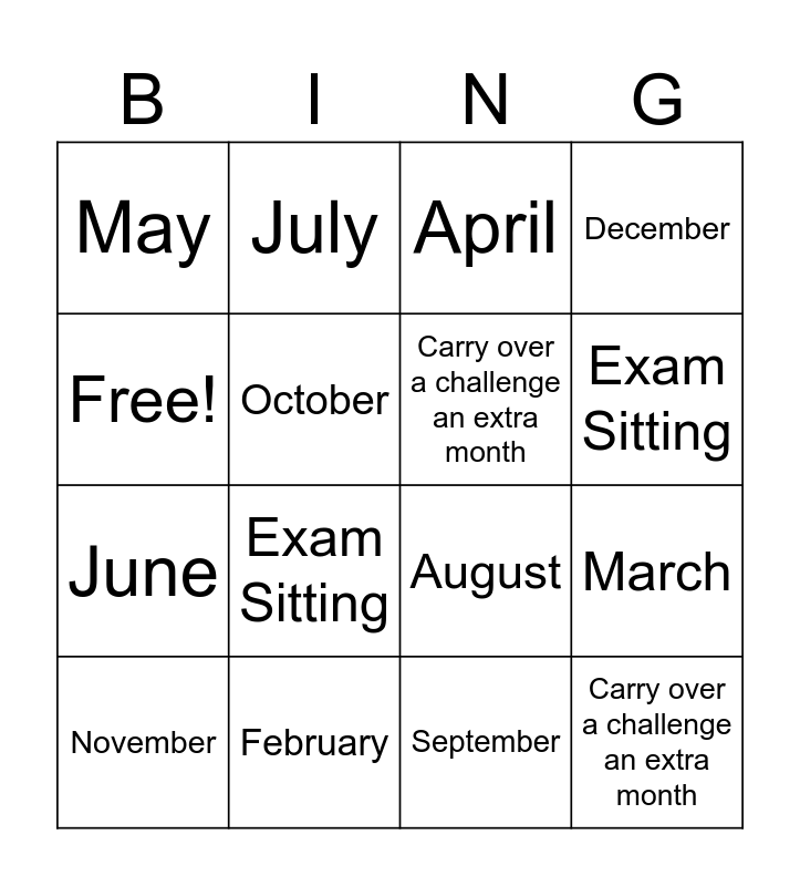 This bingo card has 16 words: February, March, April, May, June, July, August, September, Free!, October, November, December, Exam Sitting, Exam Sitting, Carry over a challenge an extra month and Carry over a challenge an extra month.