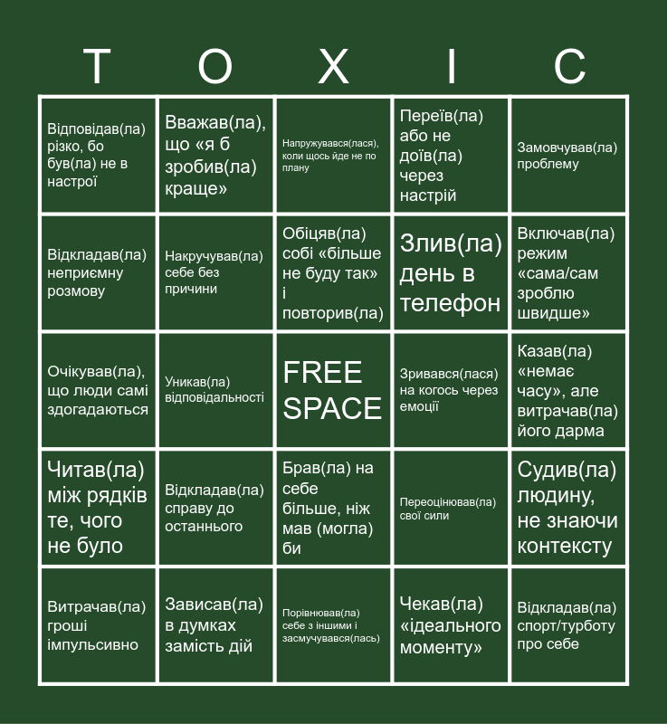 This bingo card has 25 words: Відкладав(ла) справу до останнього, Порівнював(ла) себе з іншими і засмучувався(лась), Обіцяв(ла) собі «більше не буду так» і повторив(ла), Витрачав(ла) гроші імпульсивно, Замовчував(ла) проблему, Відповідав(ла) різко, бо був(ла) не в настрої, Відкладав(ла) неприємну розмову, Вважав(ла), що «я б зробив(ла) краще», Зривався(лася) на когось через емоції, Брав(ла) на себе більше, ніж мав (могла) би, Злив(ла) день в телефон, Очікував(ла), що люди самі здогадаються, Переоцінював(ла) свої сили, Судив(ла) людину, не знаючи контексту, Накручував(ла) себе без причини, Відкладав(ла) спорт/турботу про себе, Казав(ла) «немає часу», але витрачав(ла) його дарма, Напружувався(лася), коли щось йде не по плану, Включав(ла) режим «сама/сам зроблю швидше», Уникав(ла) відповідальності, FREE SPACE, Зависав(ла) в думках замість дій, Читав(ла) між рядків те, чого не було, Переїв(ла) або не доїв(ла) через настрій and Чекав(ла) «ідеального моменту».