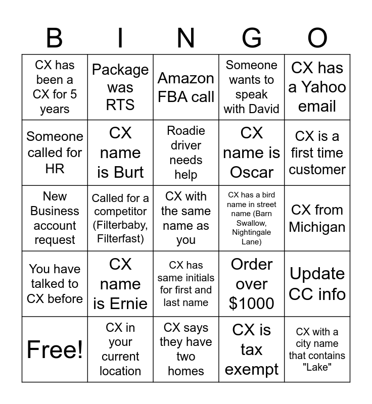 This bingo card has a free space and 29 words: Free!, Started a SUB, Called for a competitor (Filterbaby, Filterfast), Water filter call, CX has been a CX for 5 years, Amazon FBA call, CX name is Burt, CX name is Ernie, CX has a bird name in street name (Barn Swallow, Nightingale Lane), CX in your current location, CX from Michigan, CX with a city name that contains "Lake", CX says they have two homes, CX is tax exempt, CX is a first time customer, Sell a Return Grille, CX has same initials for first and last name, You have talked to CX before, CX has a Yahoo email, New Business account request, Order over $1000, Order qty over 100, CX name is Oscar, Someone called for HR, Someone wants to speak with David, Package was RTS, Update CC info, Roadie driver needs help and Canadian Order.