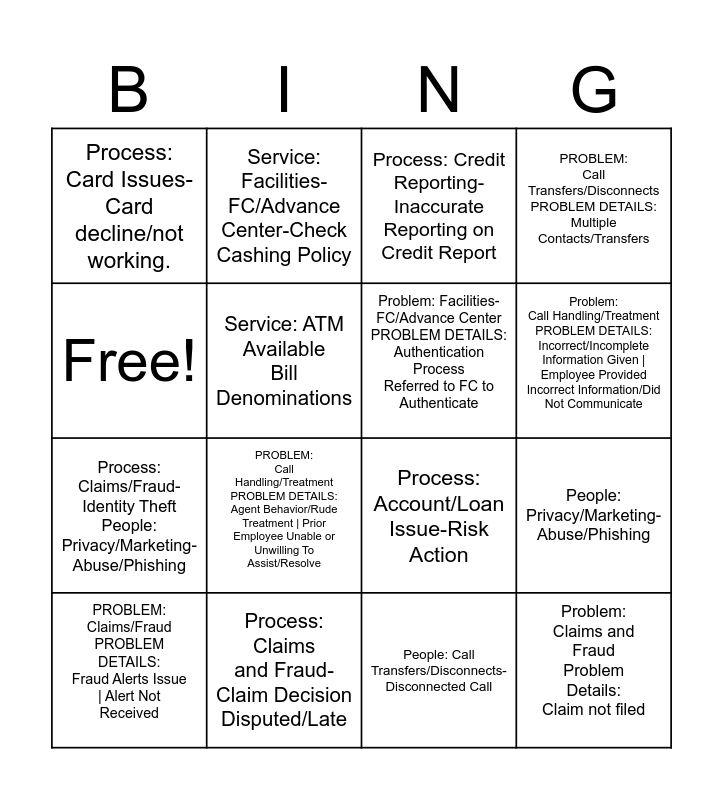 This bingo card has 16 words: Process: Claims and Fraud- Claim Decision Disputed/Late, People: Privacy/Marketing- Abuse/Phishing, Process: Credit Reporting- Inaccurate Reporting on Credit Report, Process: Card Issues- Card decline/not working., Process: Claims/Fraud- Identity Theft People: Privacy/Marketing- Abuse/Phishing, Service: Facilities- FC/Advance Center-Check Cashing Policy, Process: Account/Loan Issue-Risk Action, People: Call Transfers/Disconnects- Disconnected Call, Free!, Service: ATM Available Bill Denominations, PROBLEM: Claims/Fraud PROBLEM DETAILS: Fraud Alerts Issue | Alert Not Received, PROBLEM: Call Transfers/Disconnects PROBLEM DETAILS: Multiple Contacts/Transfers, PROBLEM: Call Handling/Treatment PROBLEM DETAILS: Agent Behavior/Rude Treatment | Prior Employee Unable or Unwilling To Assist/Resolve, Problem: Call Handling/Treatment PROBLEM DETAILS: Incorrect/Incomplete Information Given | Employee Provided Incorrect Information/Did Not Communicate, Problem: Facilities- FC/Advance Center PROBLEM DETAILS: Authentication Process Referred to FC to Authenticate and Problem: Claims and Fraud Problem Details: Claim not filed.