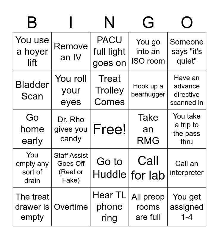 This bingo card has a free space and 24 words: Staff Assist Goes Off (Real or Fake), Overtime, Treat Trolley Comes, The treat drawer is empty, Someone says "it's quiet", You use a hoyer lift, Bladder Scan, Remove an IV, Take an RMG, Go to Huddle, Hook up a bearhugger, Go home early, Call for lab, Call an interpreter, You roll your eyes, All preop rooms are full, You take a trip to the pass thru, PACU full light goes on, Have an advance directive scanned in, Dr. Rho gives you candy, You get assigned 1-4, You empty any sort of drain, You go into an ISO room and Hear TL phone ring.