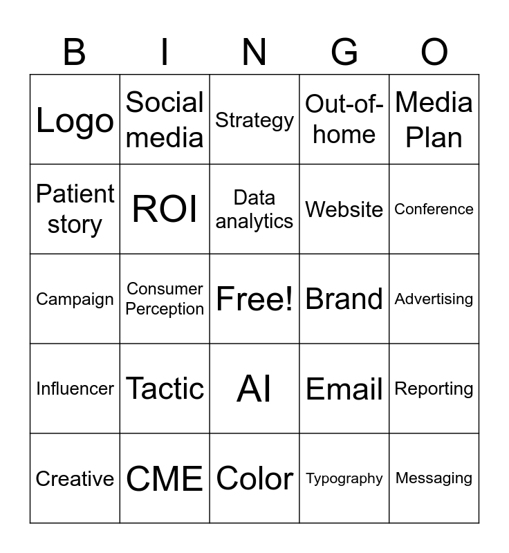 This bingo card has a free space and 24 words: Tactic, CME, Data analytics, Creative, Media Plan, Logo, Patient story, Social media, Brand, AI, Website, Campaign, Email, Reporting, ROI, Typography, Advertising, Strategy, Conference, Consumer Perception, Messaging, Influencer, Out-of-home and Color.