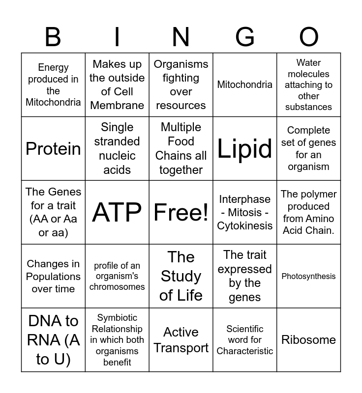 This bingo card has a free space and 34 words: Virus replicating and releasing it's DNA, Scientific word for Characteristic, Survival of the Fittest, 3 Successive Nucleotides, Changes in Populations over time, Single stranded nucleic acids, Water molecules attaching to other substances, DNA to RNA (A to U), Makes up the outside of Cell Membrane, mRNA to Amino Acid, Multiple Food Chains all together, Organisms fighting over resources, Water molecules attaching to other water molecules, In Humans 2n=46, Interphase - Mitosis - Cytokinesis, Complete set of genes for an organism, Symbiotic Relationship in which both organisms benefit, The Genes for a trait (AA or Aa or aa), profile of an organism's chromosomes, The trait expressed by the genes, The Study of Life, Different versions of a gene., Energy produced in the Mitochondria, The polymer produced from Amino Acid Chain., Active Transport, Ribosome, Mitochondria, Carbohydrate, Lipid, Protein, Nucleic Acid, ATP, Photosynthesis and Cellular Respiration.
