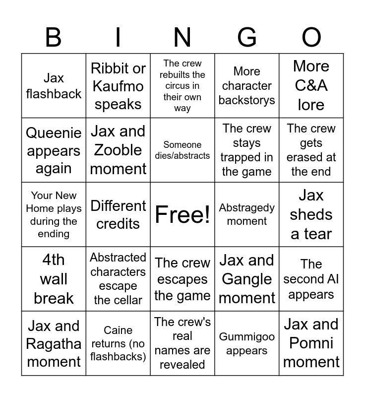 This bingo card has a free space and 24 words: Abstracted characters escape the cellar, Caine returns (no flashbacks), Someone dies/abstracts, Jax and Ragatha moment, More C&A lore, Jax flashback, Queenie appears again, Ribbit or Kaufmo speaks, Abstragedy moment, The crew escapes the game, The crew stays trapped in the game, Your New Home plays during the ending, Jax and Gangle moment, The second AI appears, Jax and Zooble moment, Gummigoo appears, Jax sheds a tear, The crew rebuilts the circus in their own way, The crew gets erased at the end, Different credits, Jax and Pomni moment, 4th wall break, More character backstorys and The crew's real names are revealed.