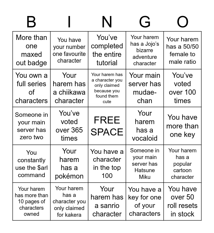 This bingo card has a free space and 24 words: Your harem has a pokémon, Your harem has a character you only claimed for kakera, Your harem has a character you only claimed because you found them cute, Your harem has more than 10 pages of characters owned, Your harem has a 50/50 female to male ratio, More than one maxed out badge, You own a full series of characters, You have your number one favourite character, Your harem has a vocaloid, You have a character in the top 100, Your main server has mudae-chan, Someone in your main server has zero two, Someone in your main server has Hatsune Miku, Your harem has a popular cartoon character, Your harem has a chiikawa character, You have a key for one of your characters, You have more than one key, You’ve completed the entire tutorial, You’ve voted over 100 times, You’ve voted over 365 times, You have over 50 roll resets in stock, You constantly use the $arl command, Your harem has a Jojo’s bizarre adventure character and Your harem has a sanrio character.