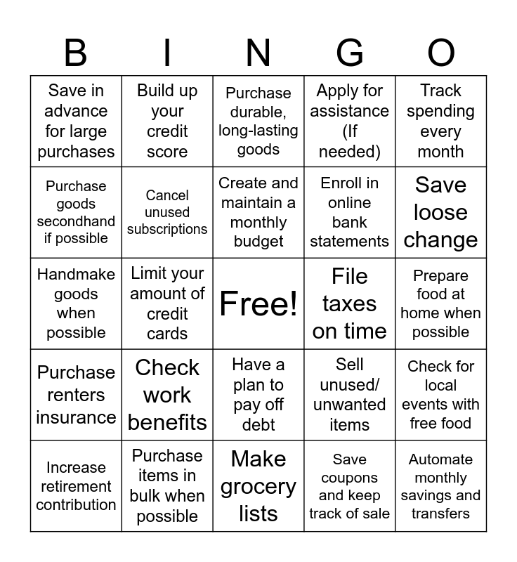 This bingo card has a free space and 39 words: Track your spending, Have an emergency fund, Increase financial literacy, Cancel unused subscriptions, Increase retirement contribution, Have a plan to pay off debt, Create and maintain a monthly budget, Set financial goals, Track spending every month, Purchase renters insurance, Limit your amount of credit cards, Apply for assistance (If needed), Automate monthly savings and transfers, Prepare food at home when possible, File taxes on time, Check work benefits, Download an online banking app, Save in advance for large purchases, Create a budget for recreational purchases, Sell unused/ unwanted items, Purchase goods secondhand if possible, Make grocery lists, Enroll in online bank statements, Save loose change, Check IRA contributions, Look into student loan forgiveness programs, Learn more about investing, Reduce/ eliminate gambling, Take advantage of credit card benefits, Build up your credit score, Apply for scholarships, Reduce impulsive purchasing, Purchase durable, long-lasting goods, Purchase items in bulk when possible, Save coupons and keep track of sale, Share and exchange goods with friends, Check for local events with free food, Handmake goods when possible and Pursue side gigs and jobs.