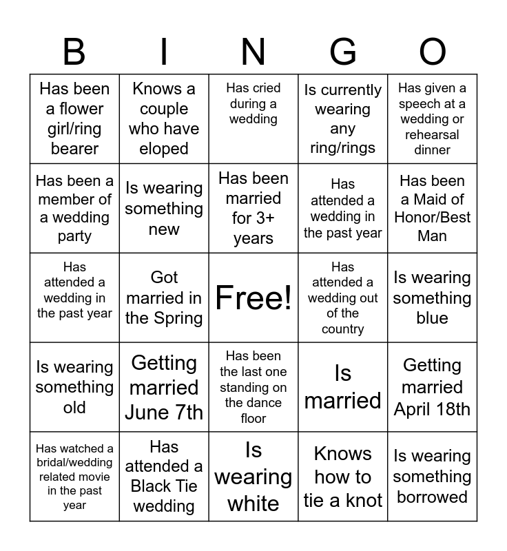 This bingo card has a free space and 24 words: Getting married June 7th, Has attended a Black Tie wedding, Has been married for 3+ years, Has watched a bridal/wedding related movie in the past year, Has given a speech at a wedding or rehearsal dinner, Has been a flower girl/ring bearer, Has been a member of a wedding party, Knows a couple who have eloped, Has attended a wedding out of the country, Has been the last one standing on the dance floor, Has attended a wedding in the past year, Has attended a wedding in the past year, Is married, Getting married April 18th, Is wearing something new, Knows how to tie a knot, Is wearing something blue, Has cried during a wedding, Has been a Maid of Honor/Best Man, Got married in the Spring, Is wearing something borrowed, Is wearing something old, Is currently wearing any ring/rings and Is wearing white.