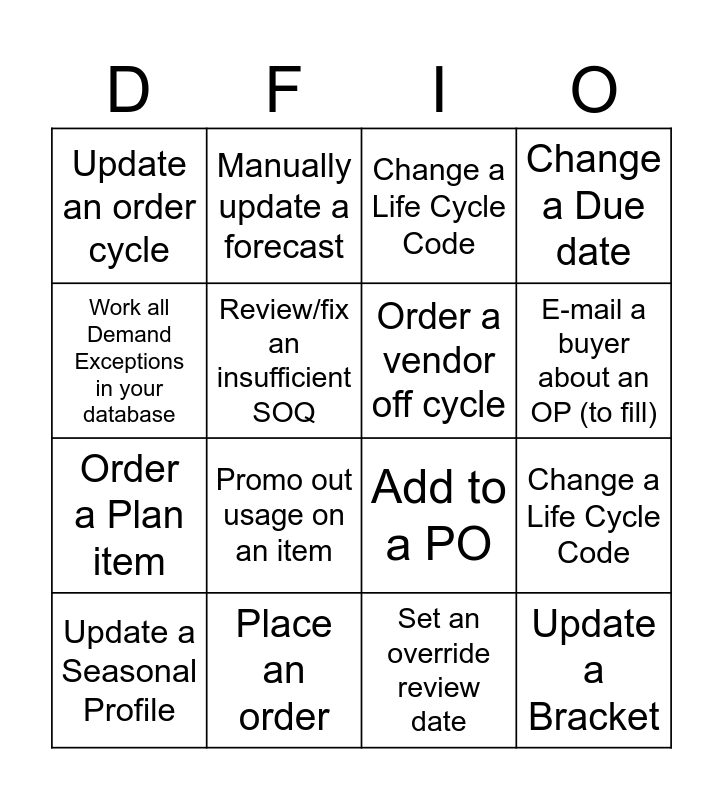 This bingo card has 21 words: Place an order, Re-initialize a forecast, Manually update a forecast, Enter a Freeze, Set an override review date, Order a vendor off cycle, Update an order cycle, Change a Life Cycle Code, Add to a PO, E-mail a buyer about an OP (to fill), Order a Plan item, Change a Due date, Update a Bracket, Order a Split Truck, Review/fix an insufficient SOQ, Put a Seasonal Profile on an item, Update a Seasonal Profile, Promo out usage on an item, Work all Demand Exceptions in your database, Change a Life Cycle Code and Enter an Item Replacement.