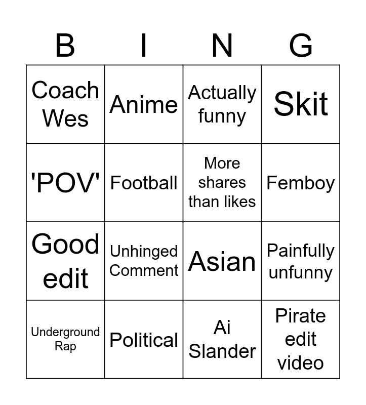 This bingo card has 22 words: Political, Glazing, Anime, Basketball, Football, More shares than likes, Coach Wes, Actually funny, Asian, Pirate edit video, Good edit, Skit, TV clip, Brainrot, Ai Slander, 'Genuinely', Painfully unfunny, Underground Rap, Unhinged Comment, 'POV', Femboy and 2 People I Follow liked the reel.